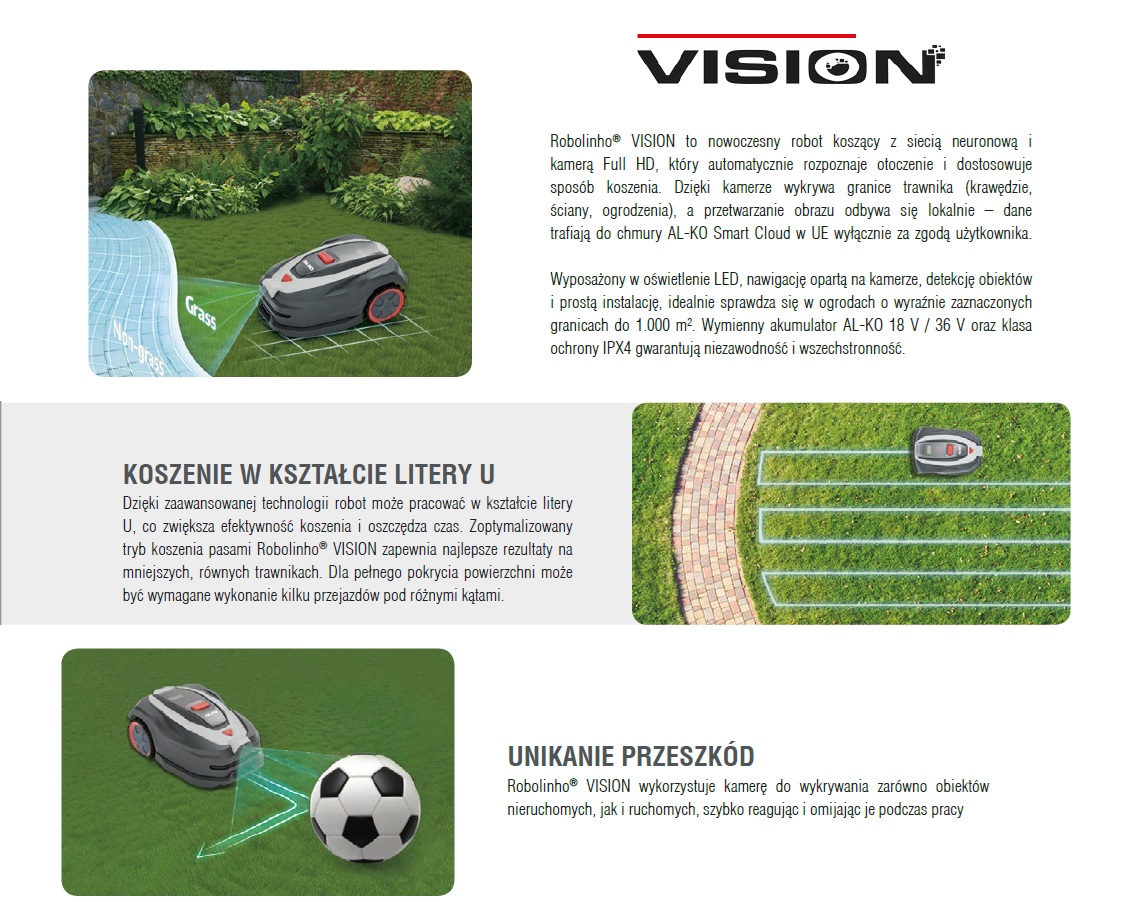 Robolinho® 500 VISION to nowoczesny robot koszący firmy AL-KO, zaprojektowany z myślą o mniejszych ogrodach. Pracuje bez przewodu ograniczającego i bez stacji referencyjnej – granice trawnika są automatycznie rozpoznawane przez kamerę. Wystarczy ustawić robota na trawie i uruchomić go. To idealne rozwiązanie dla prostych, wyraźnie wydzielonych powierzchni.